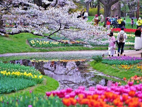 みなさーん 桜の次は ツツジね (~ ̄▽ ̄)~ チューリップ φ(゜▽゜*)♪ [http://blog.hatena.ne.jp/-/odai/26006613550729664:title=お題「わたしの癒やし」 桜ふぶきの中で咲き誇るチューリップが 渓流広場 昭和記念公園 2023年3月末 www.showakinen-koen.jp …