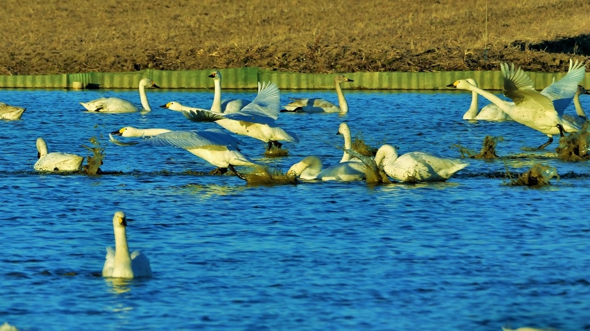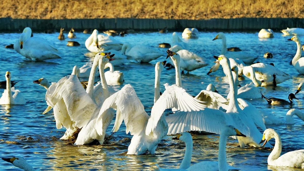 15時くらいに水田に帰ってきた白鳥への餌やりが始まった。我先にと餌に群がる姿はすごい迫力、、、集団で、おしくらまんじゅうしているようだった。