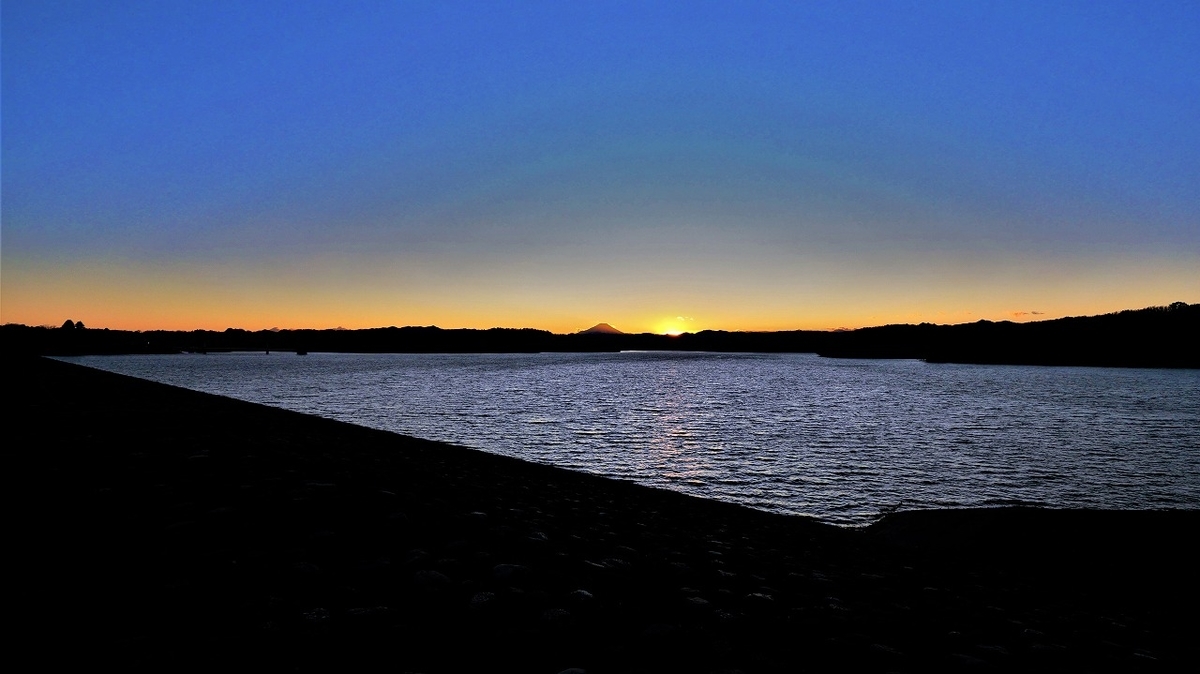 クリスマス寒波だという、、、冷たい風が吹きすさぶ中、晴れ渡った夕刻の狭山湖の先に富士山が顔をだしていた。