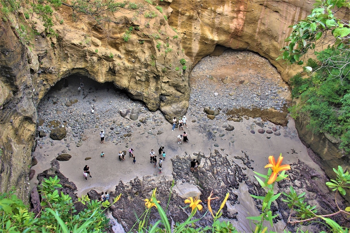龍宮窟と呼ばれる洞窟を見学した。洞窟に入るとすぐにぽっかりと天窓が開いて空が見えた。洞窟からは相模湾の荒波で長い間にやわらかい所から削られて洞窟、、、そしてついに天井が崩落したという。洞窟の外で荒波が砕けているのが見えるが、洞窟内は静かだった。