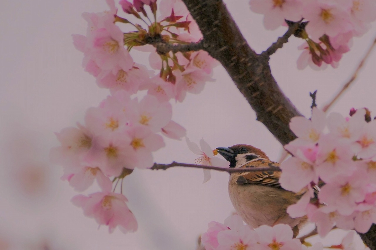 旧中川の河川敷を上流に向かって歩いた。穏やかな水面にも映るピンク色の桜並木の歩道では自然に足取りが軽くなった。ムクドリやスズメ、ユリカモメなどいっぱいいてのどかな雰囲気だった。