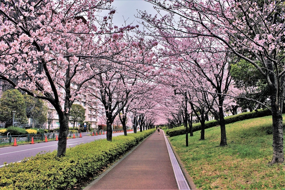 都の「荒川スーパー堤防整備」に合わせて設けられた、約2kmにわたって続く桜道。