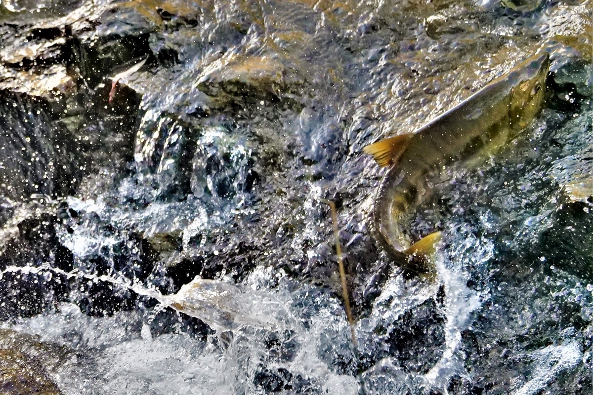 知床の斜里町ウトロを流れるペレケ川をサケの群れが遡上していた。