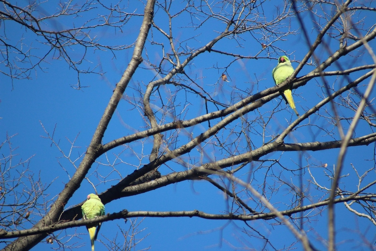 代々木公園へ行ってみると黄緑の鳥たちがギャーギャーと大きな声で鳴いていた。この公園では初めて見たがどう見てもインコだ。ペットとして輸入されたものと思うが、かなり繁殖しているらしい。いつもは、カラスばかりが目立つので少し明るくなったような気がした。