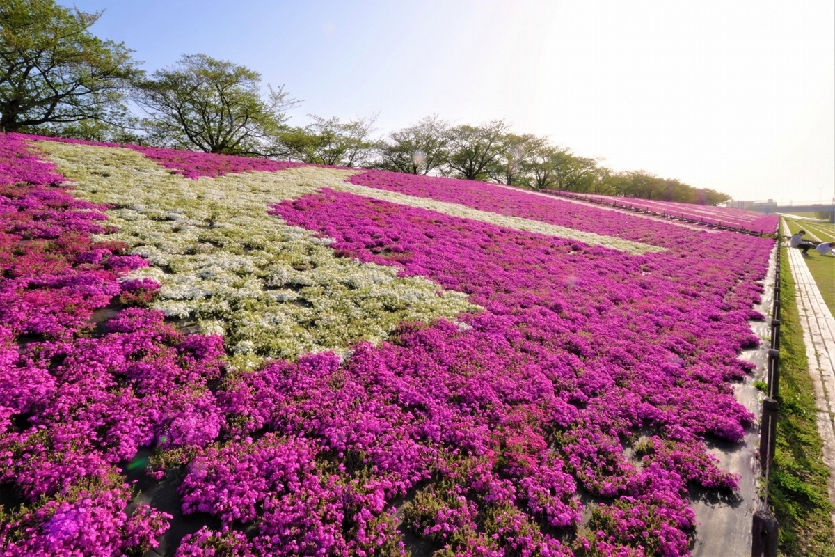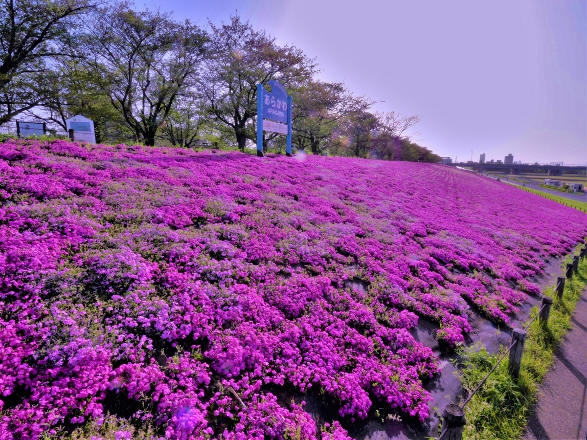 荒川河川敷が華やかな芝桜で覆われて春色の景観が広がっていた。