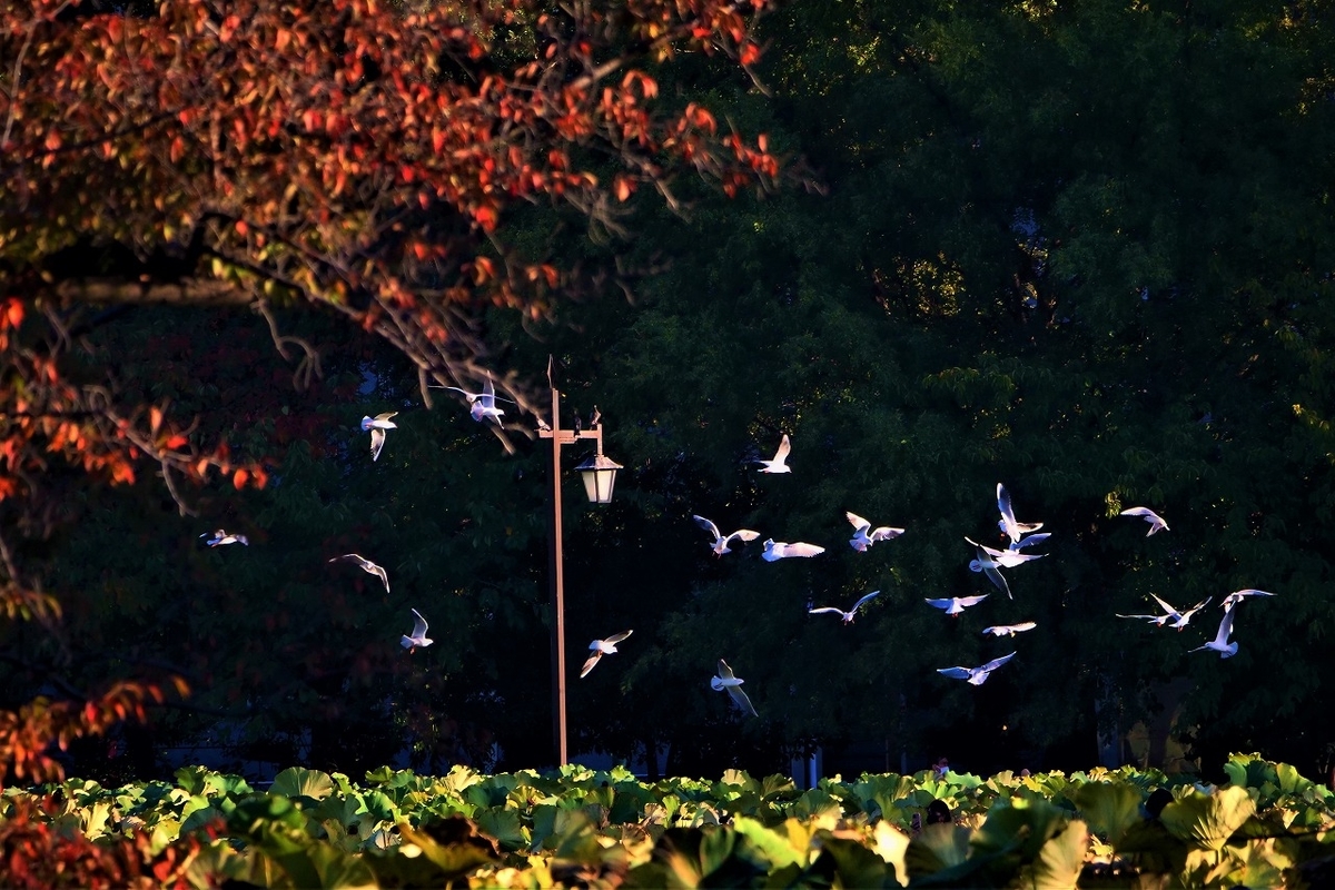 秋晴れの不忍池が、ユリカモメの群れで賑やかだった。