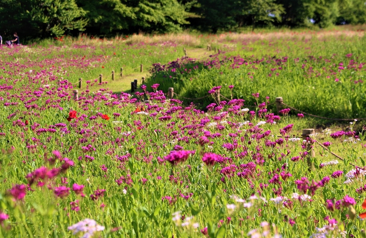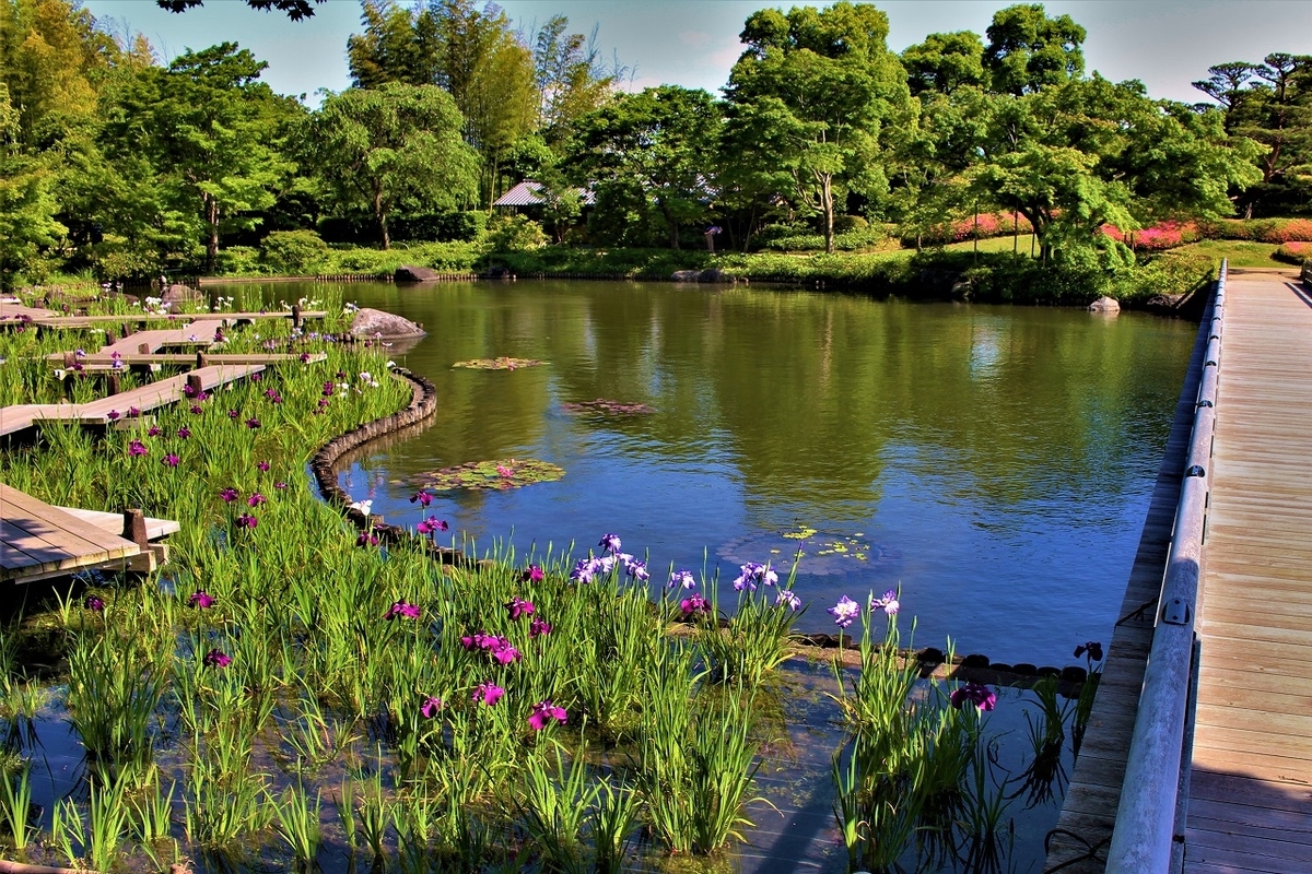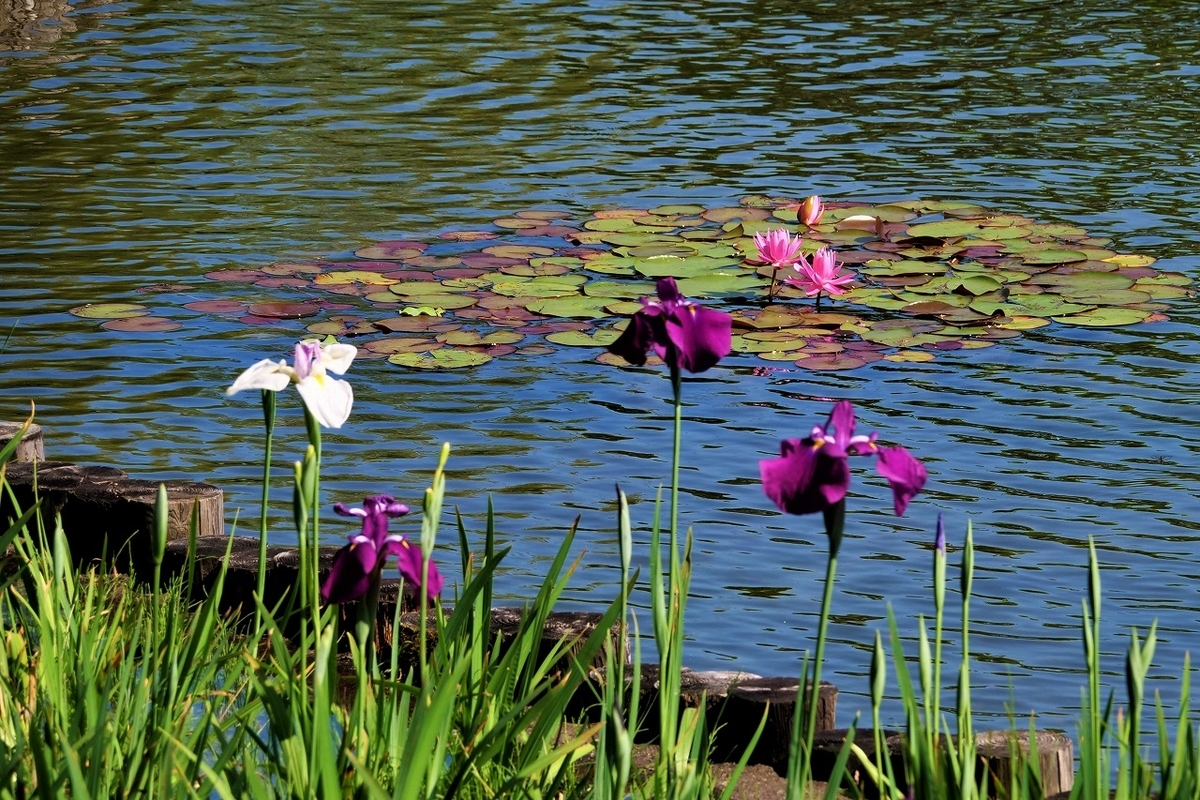 もう花の丘は見頃すぎの雰囲気だったが、コマチソウやヤグルマギクがきれいだった。日本庭園の水辺はハナショウブが咲き始め涼しげだった。