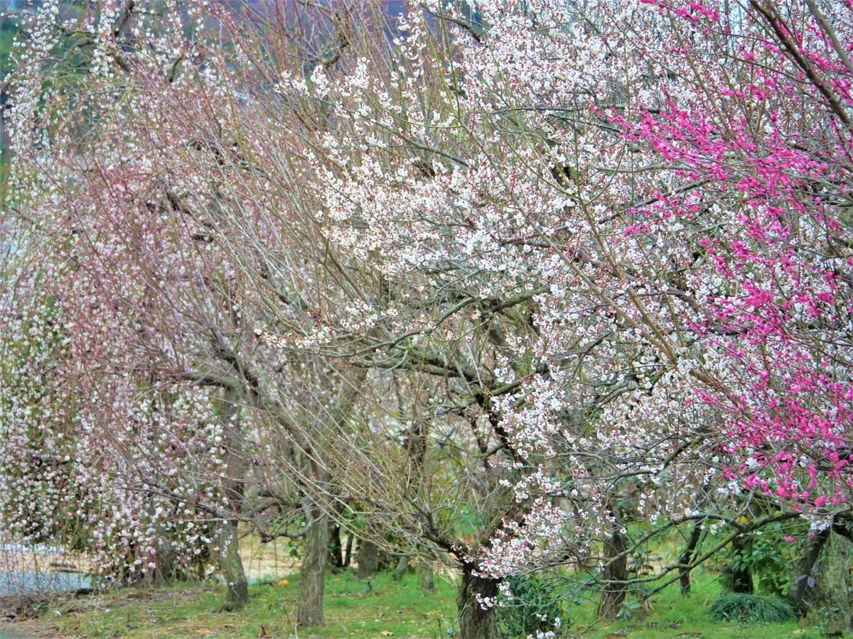 食用の白梅がメインで35,000本という。ところどころに紅梅やしだれ梅、、、見頃になっていて華やかなエリアもあった。