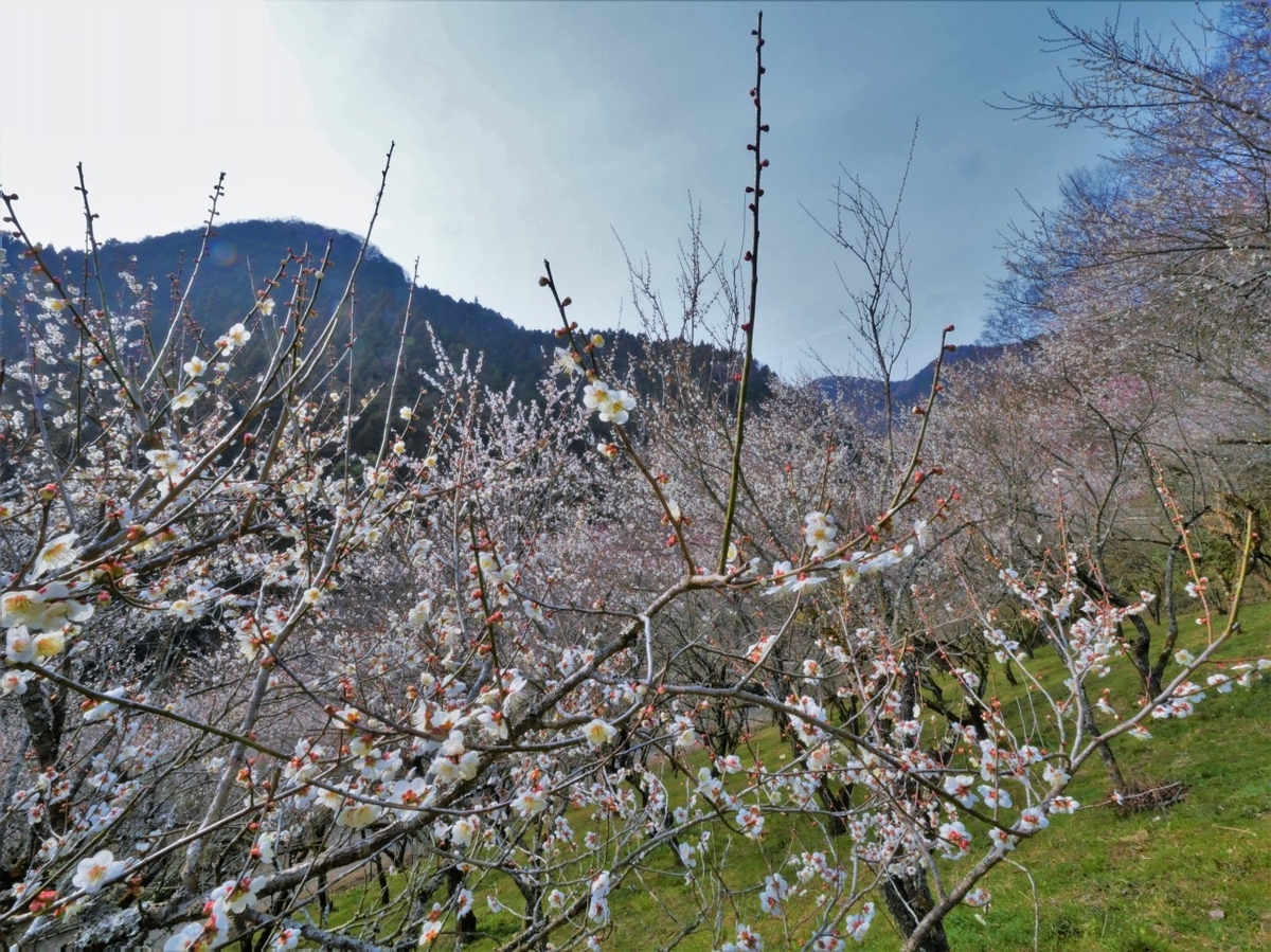 木下沢梅林は丘陵を梅の花が埋め尽くし山々の景色の中で輝いていた。園内のトレッキングコースを登ったところにあるベンチ、、、梅の香りに包まれて幸せだった。
