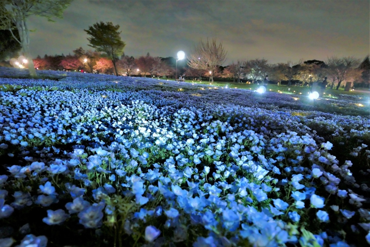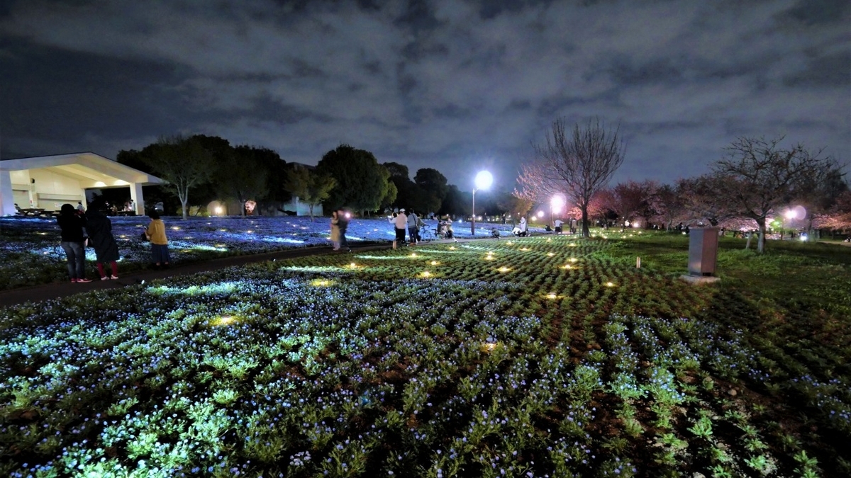 夜の千本桜まつり開催中の舎人公園、、、幻想的なネモフィラ花壇付近は、静かに花見を楽しむ人たちで賑わっていた。
