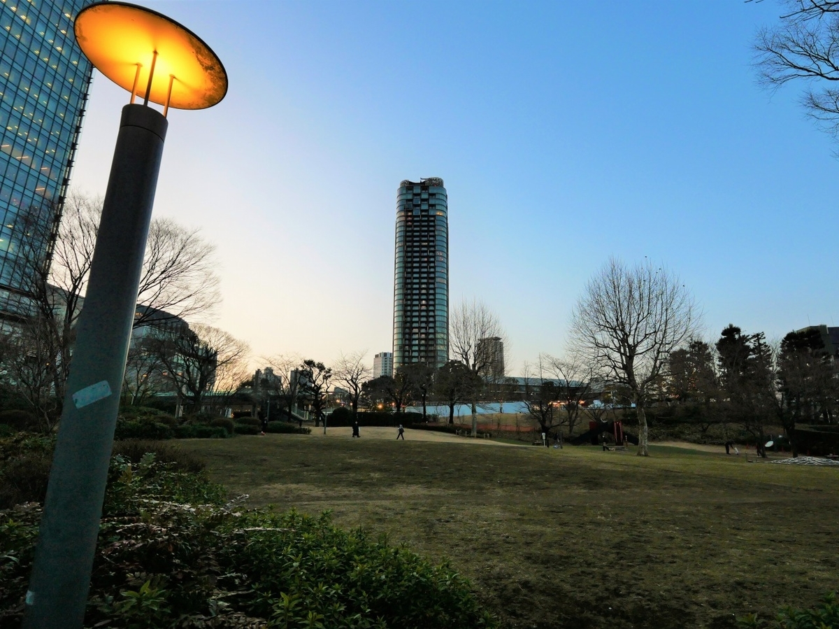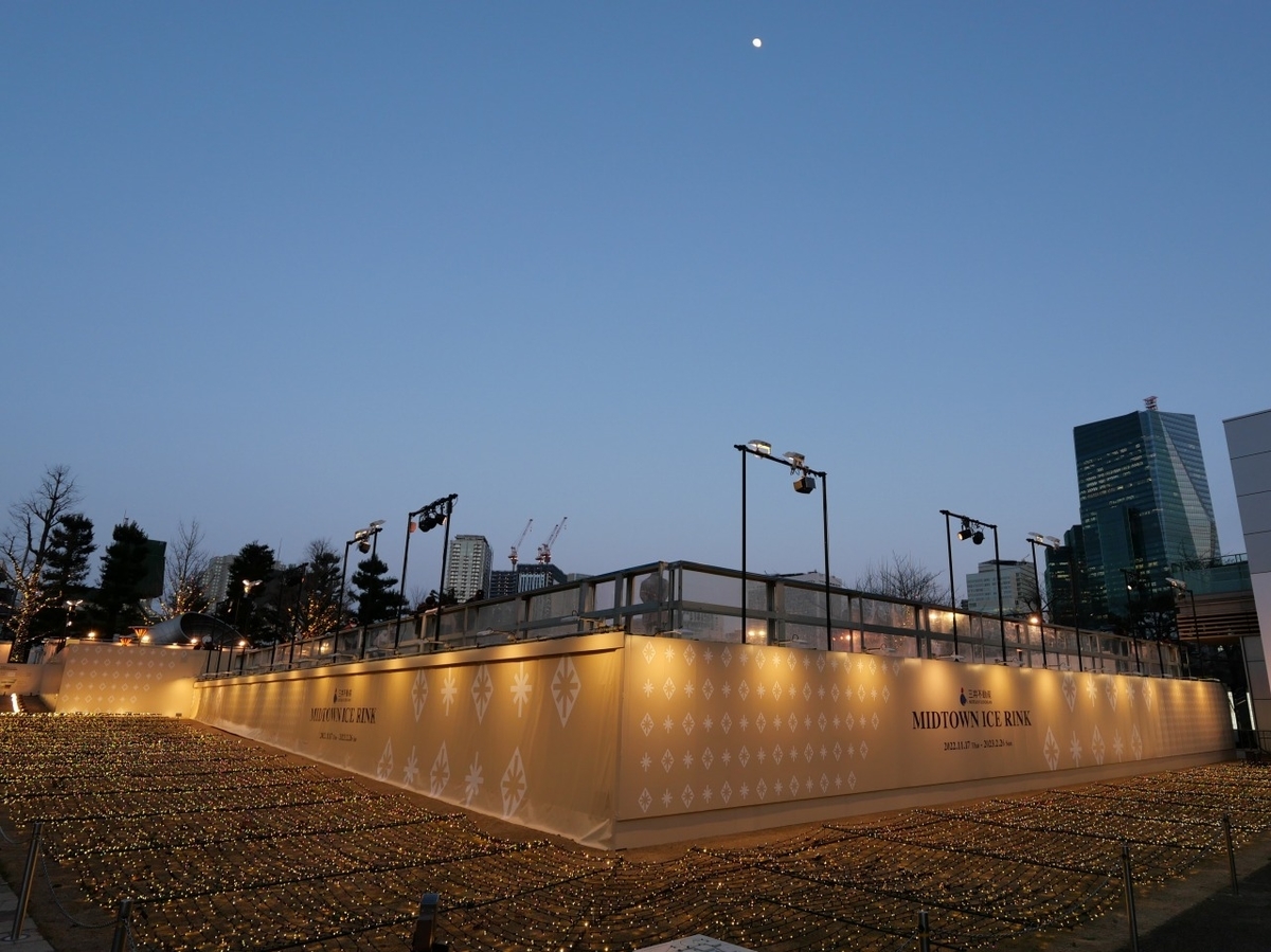 年末には、イルミネーションで賑わったミッドタウン、、、静かな夕暮れを迎えていた。芝生広場のとなりにあるアイスリンクだけが賑わっていた。