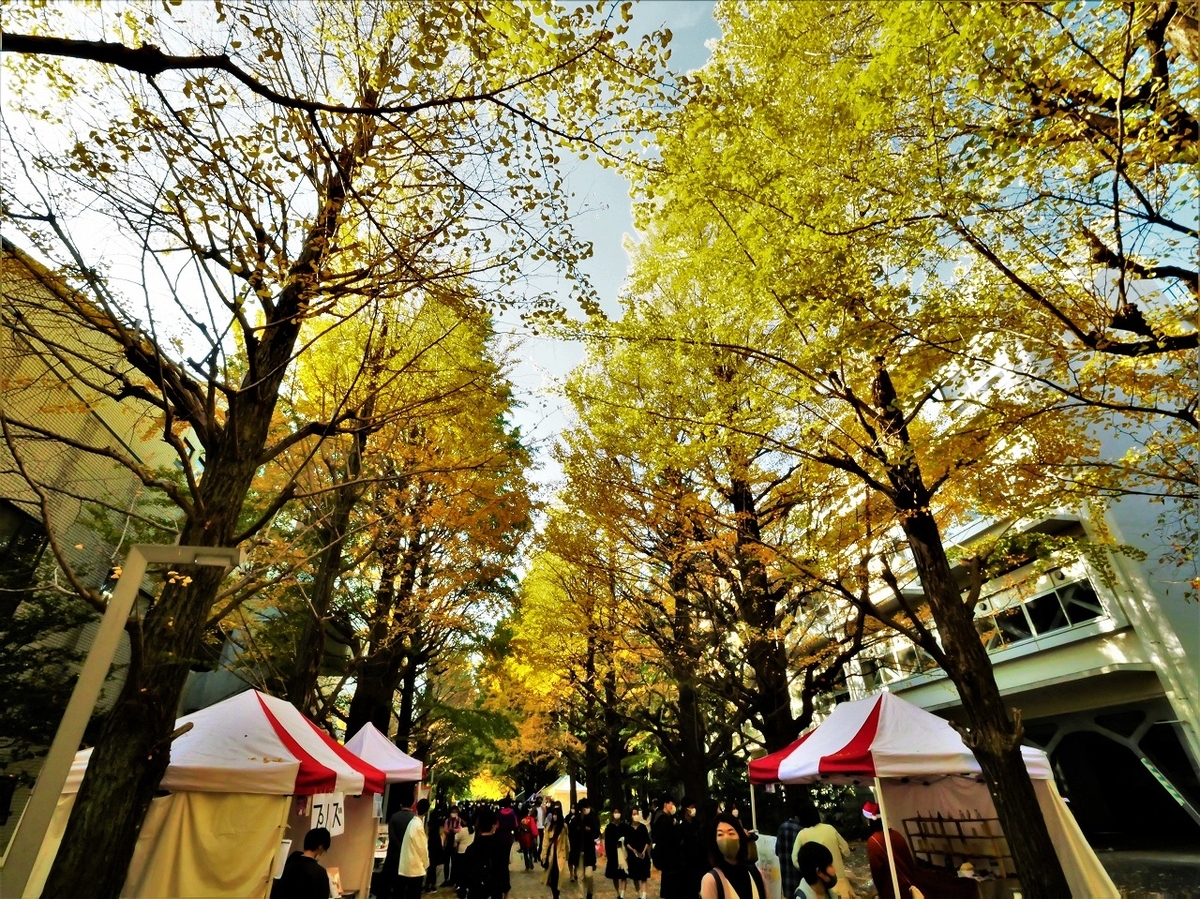 東大駒場キャンパスが秋の日差しを浴びたイチョウ並木の下、熱気で光り輝いていた。